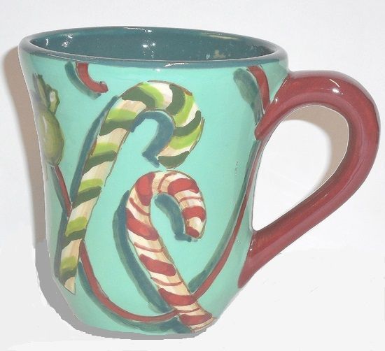 This sweet mug is 4-1/4" tall by 4" wide. A red and white striped pinwheel lollipop is on the other side. Click on photo to enlarge for details.